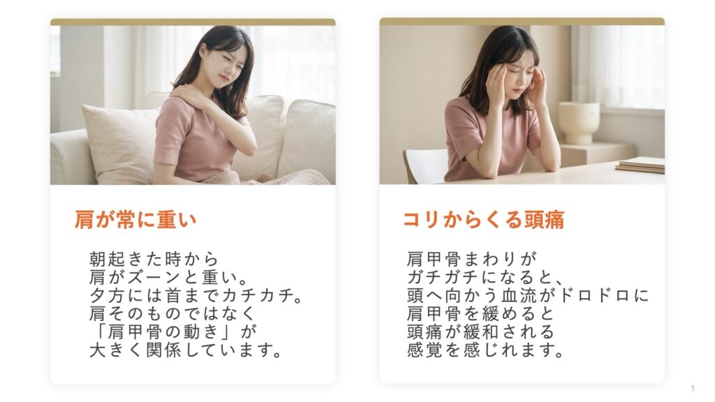 肩と首の重さがずっと抜けなくて、夕方になると頭まで重くなり、「今日もか…」とため息が出る毎日でした。