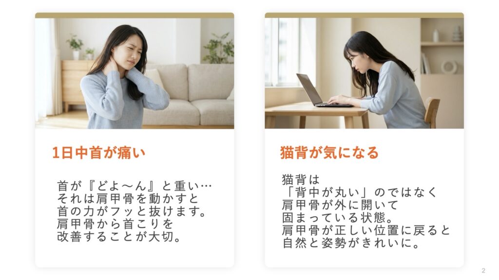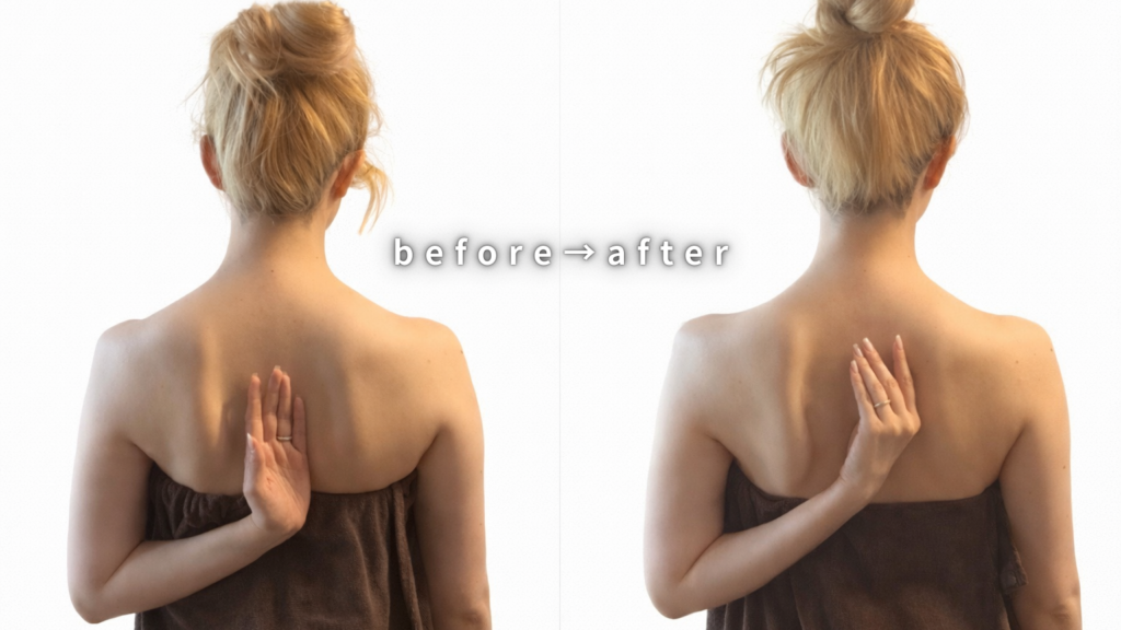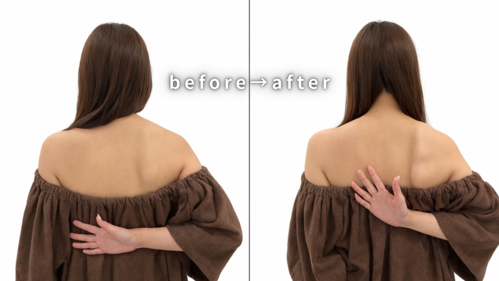 施術後、肩甲骨まわりが「動く」感覚が出て、胸が自然に開きやすくなったのが分かりました。